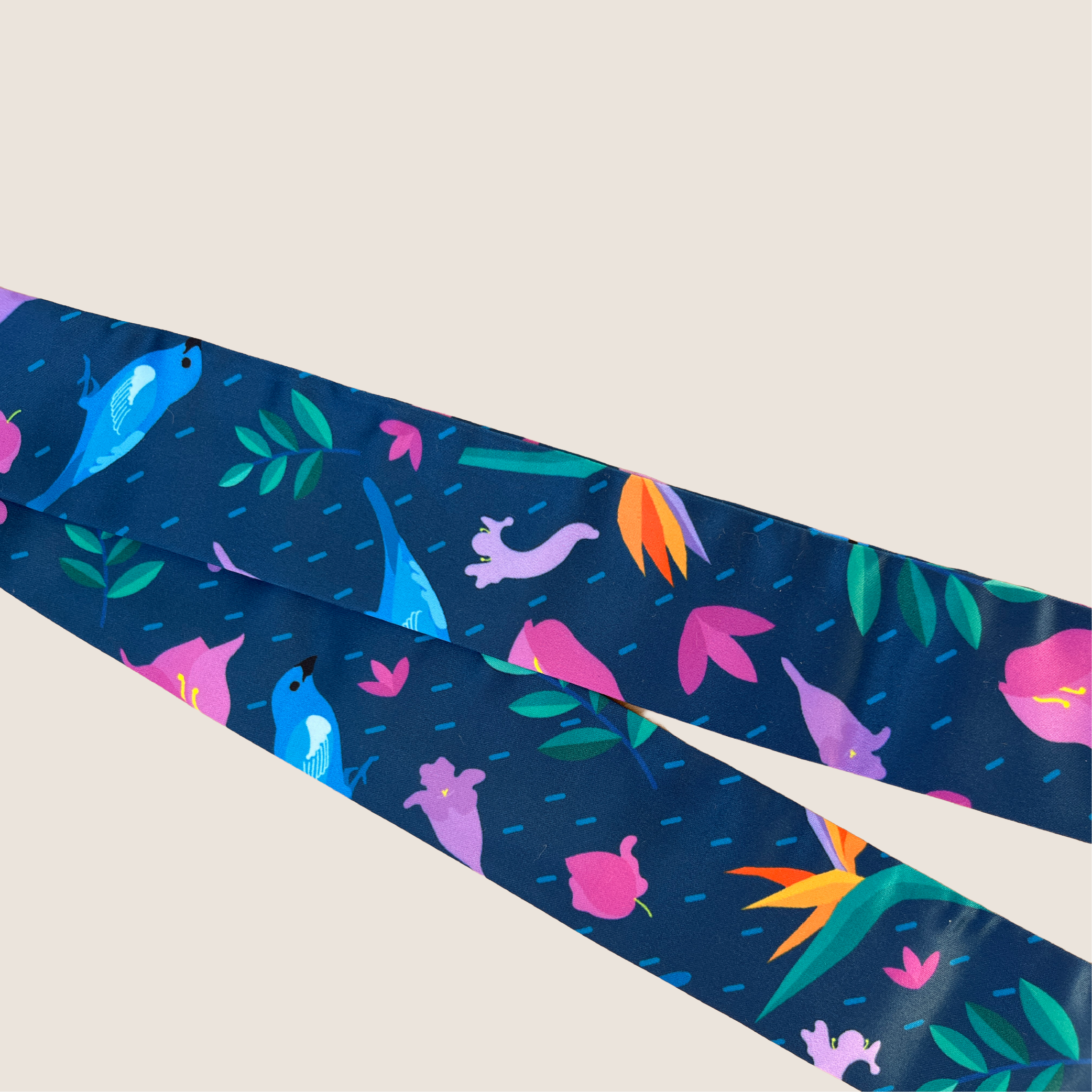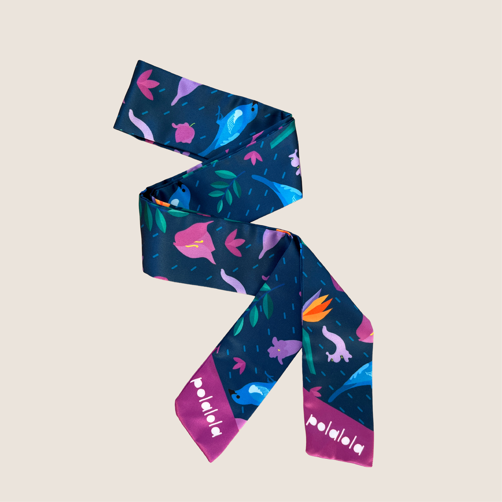 Accesorio hecho de seda italiana ideal para utilizar en la coleta, cuello, bolso o alrededor del sombrero
